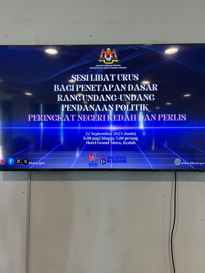 Kedah Indian Chamber of Commerce and Industry (KICCI) members attended the Sesi Libat Urus bagi Penetapan Dasar Rang Undang-Undang Pendanaan Politik Peringkat Negeri Kedah dan Perlis on Monday, 22 September 2025, held at Hotel Grand Alora, Kedah, from 8:00 AM to 5:00 PM.
